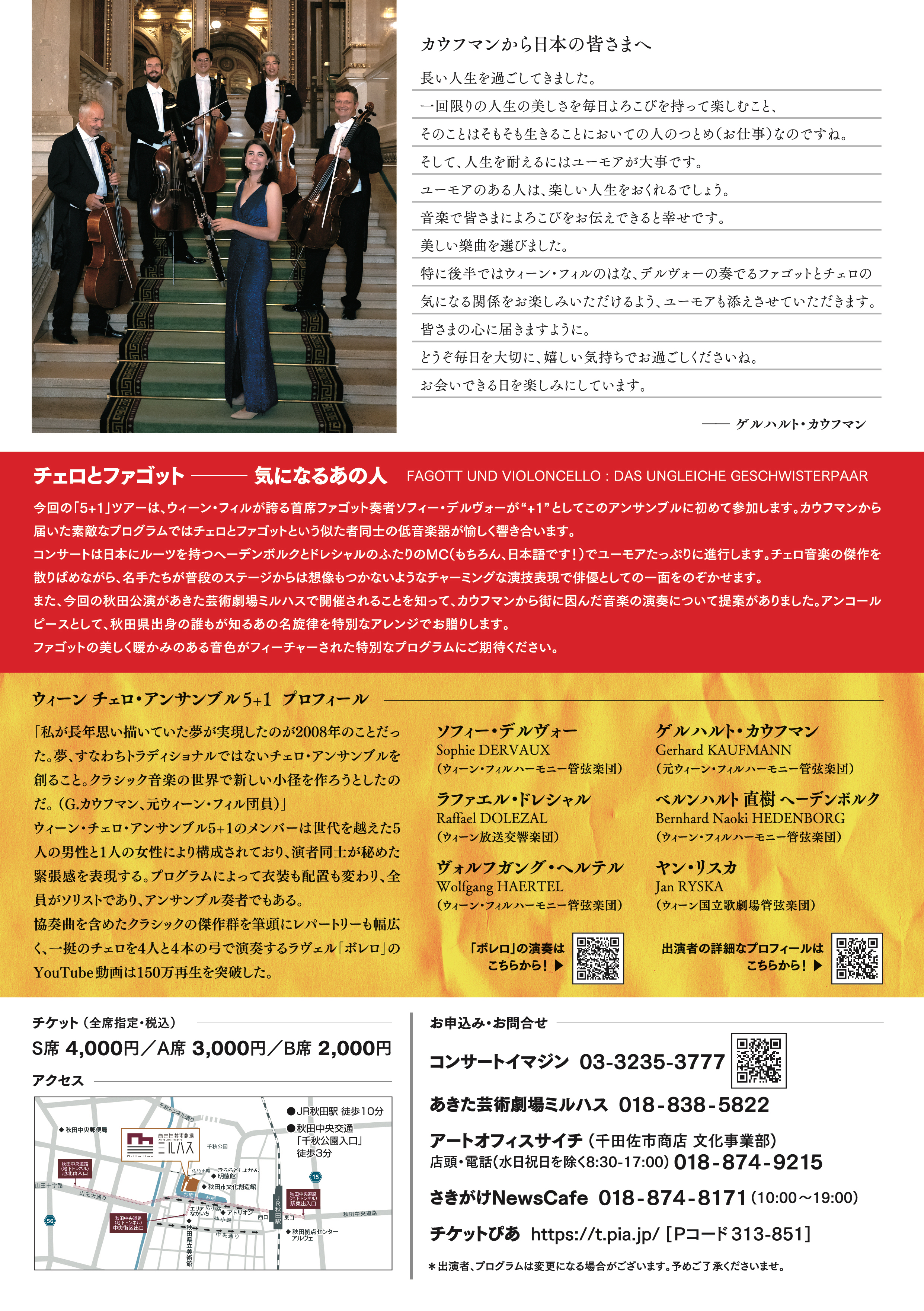 今回の「5+1」ツアーは、ウィーン・フィルが誇る首席ファゴット奏者ソフィー・デルヴォーが ”+1” としてこのアンサンブルに初めて参加します。元ウィーン・フィルハーモニー管弦楽団メンバーのゲルハルト・カウフマンから届いた素敵なプログラムではチェロとファゴットという似た者同士の低音楽器が愉しく響き合います。